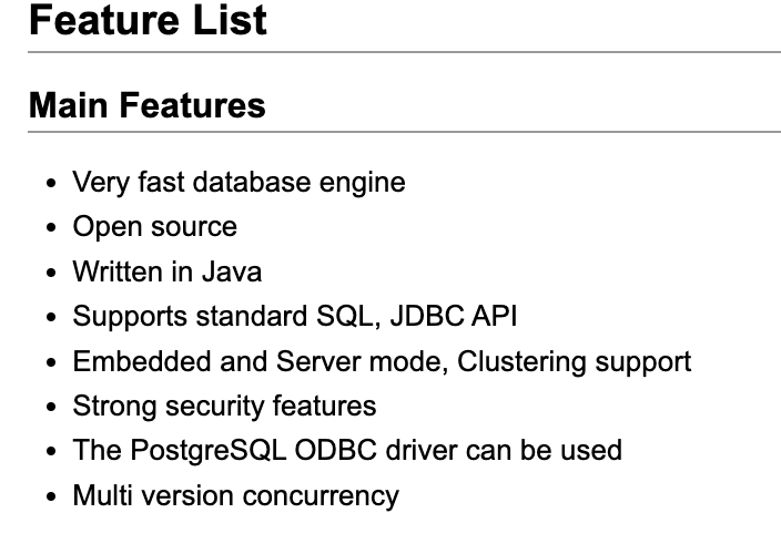 Features Feature List H2 in Use Connection Modes Database URL Overview Connecting to an Embedded (Local) Database In-Memory Databases Database Files Encryption Database File Locking Opening a Database Only if it Already Exists Closing a Database Ignore