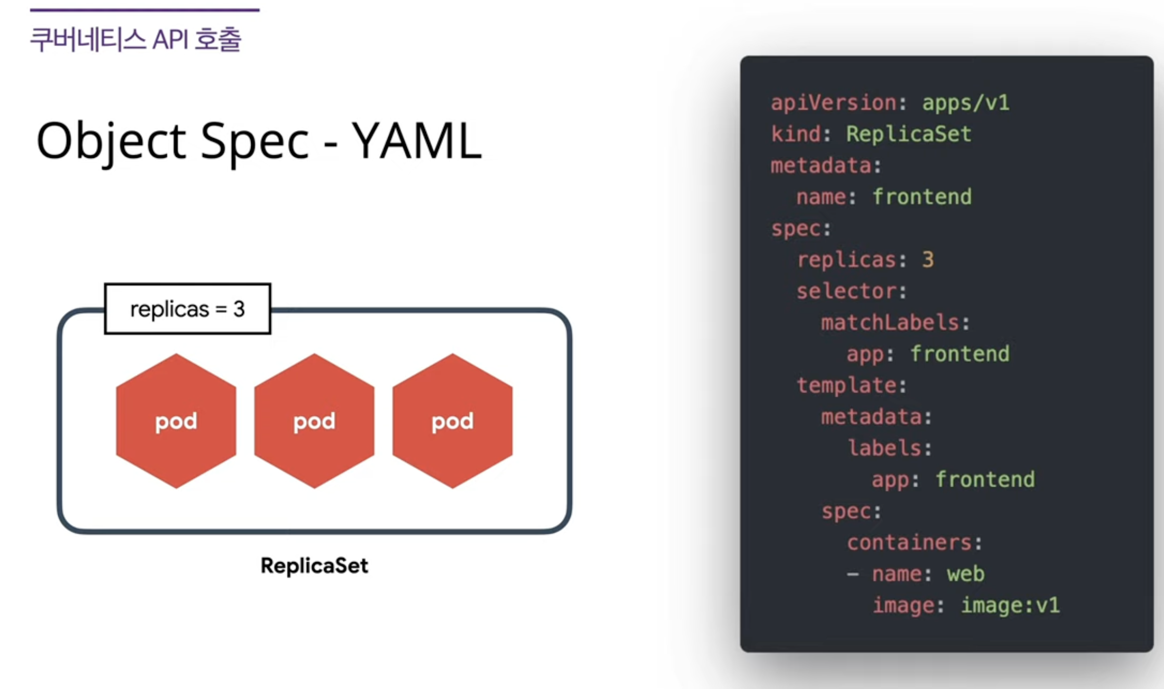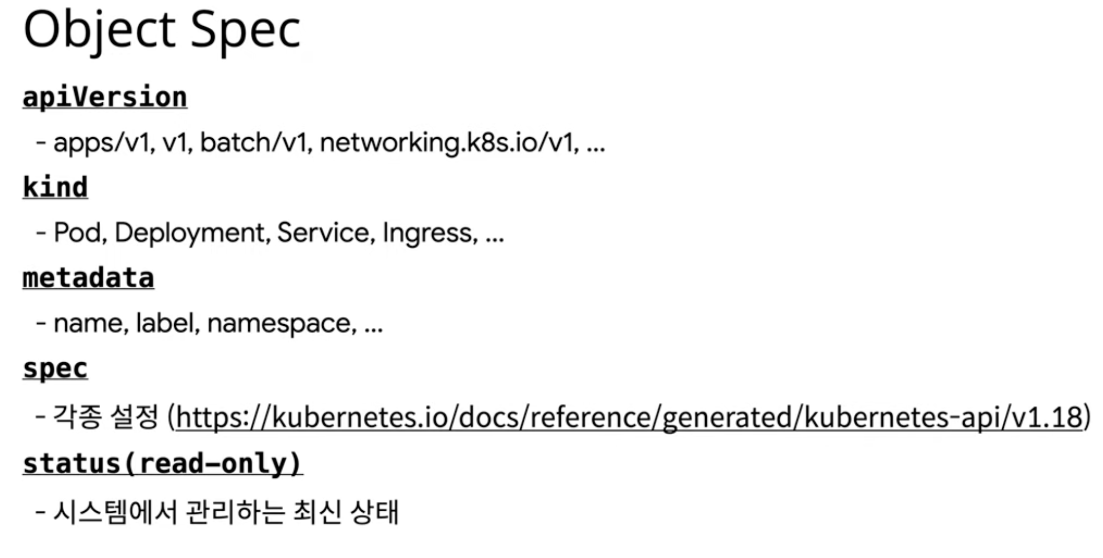 원하는 상태(desired state)를 다양한 object로 정의(spec)하고 API서버에 yaml 형식으로 전달해준다