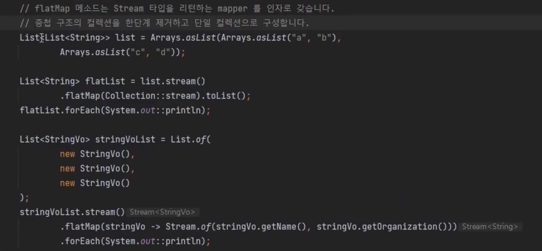 flatMapping 의 경우 중첩 구조 컬렉션을 한단계 제거한 뒤 단일 컬렉션을 구성할 수 있다