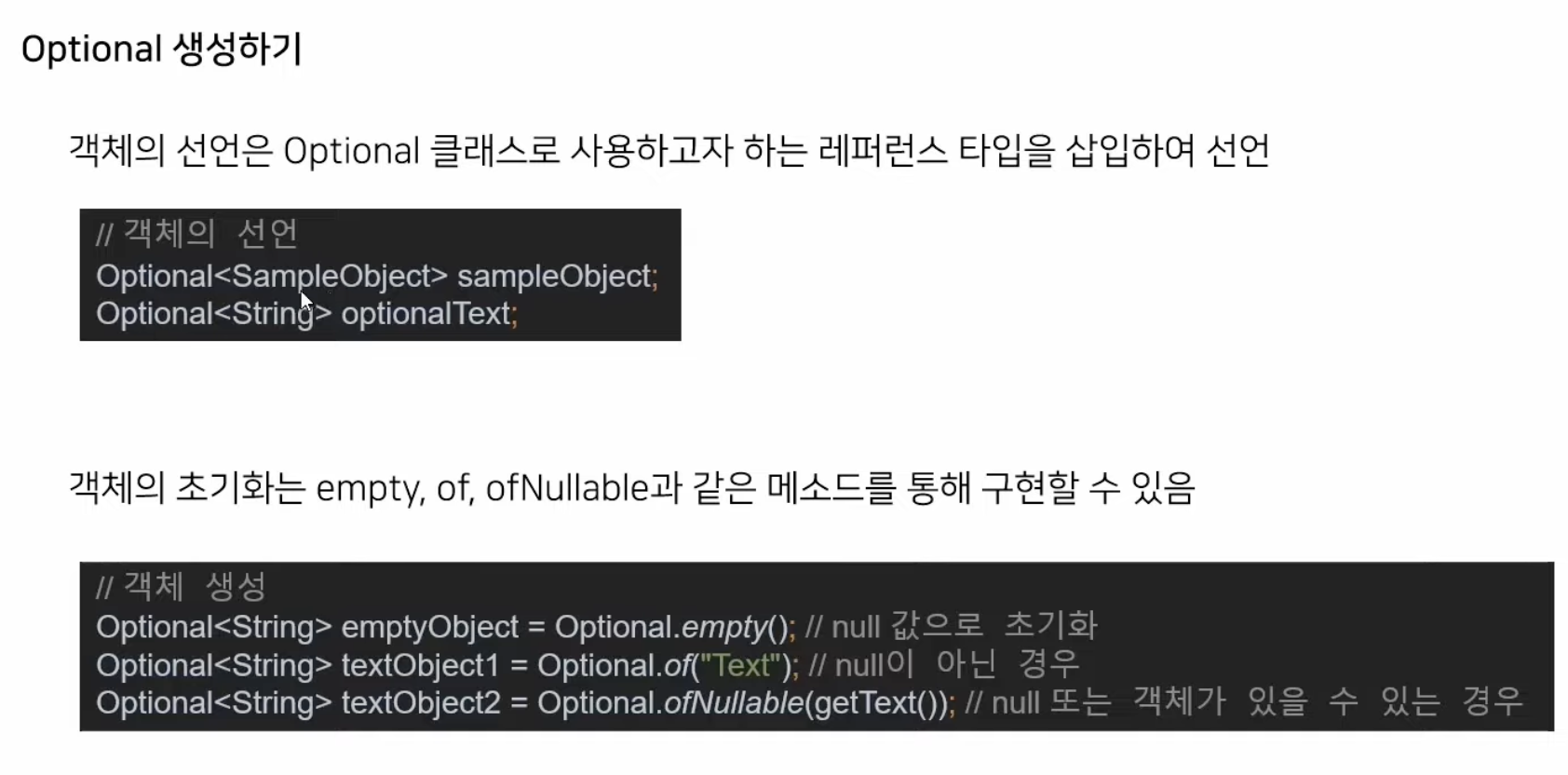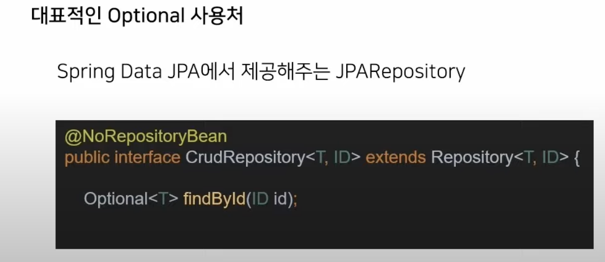 하지만 어쩔 수 없이 Null 을 처리해야하는 상황이 오는데 이때 이 Optional을 사용한다