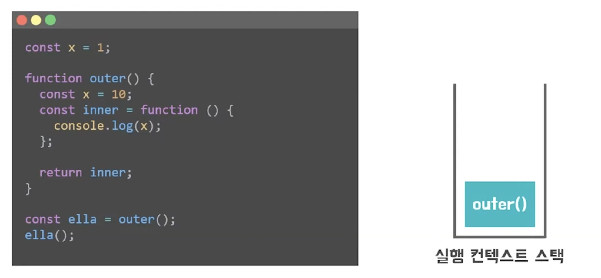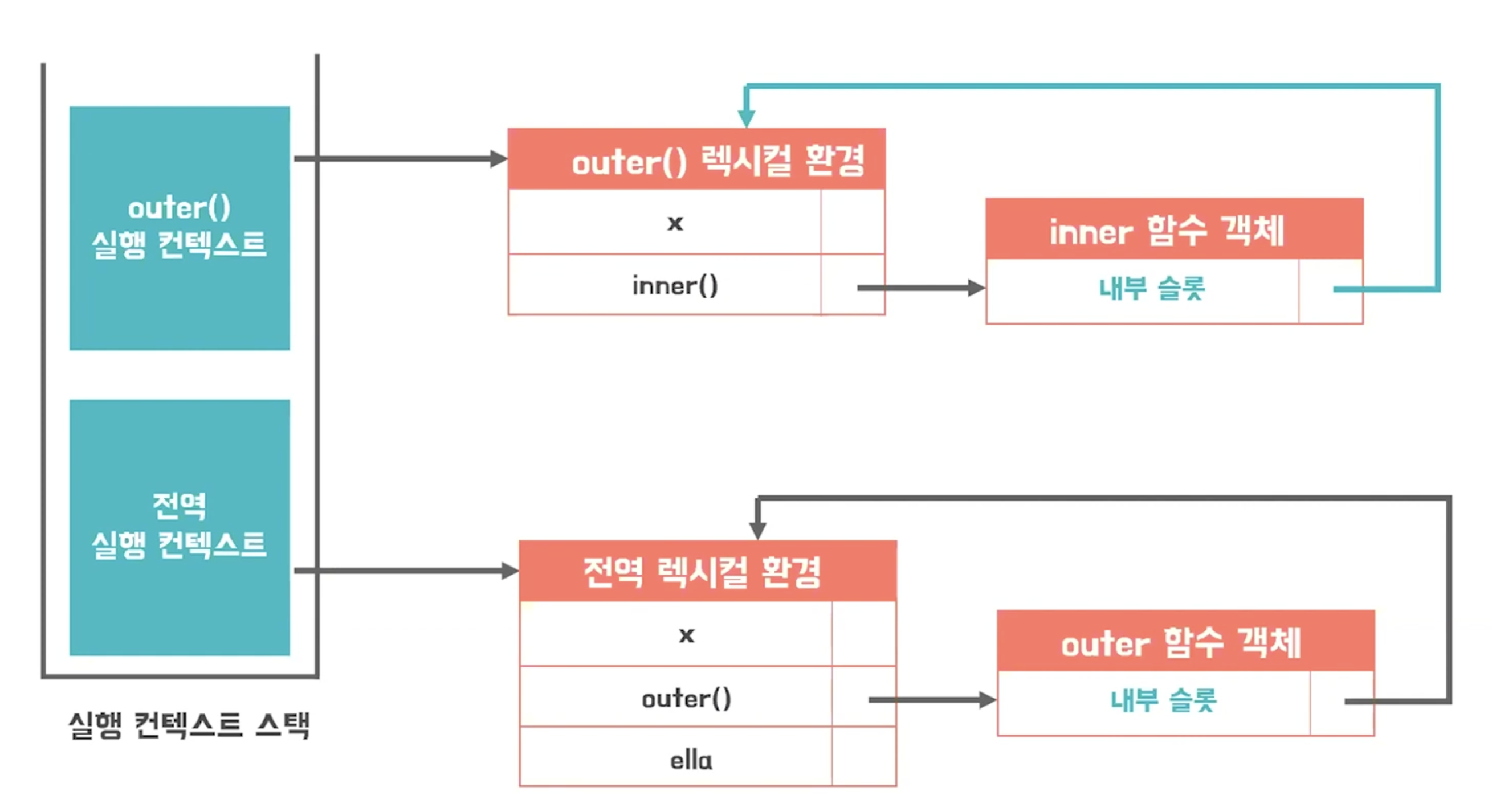 outer함수 실행 시 코드실행 된 다음 실행 컨택스트 스택에서 팝 되면서 라이프사이클 주기에서 마감하게 된다.