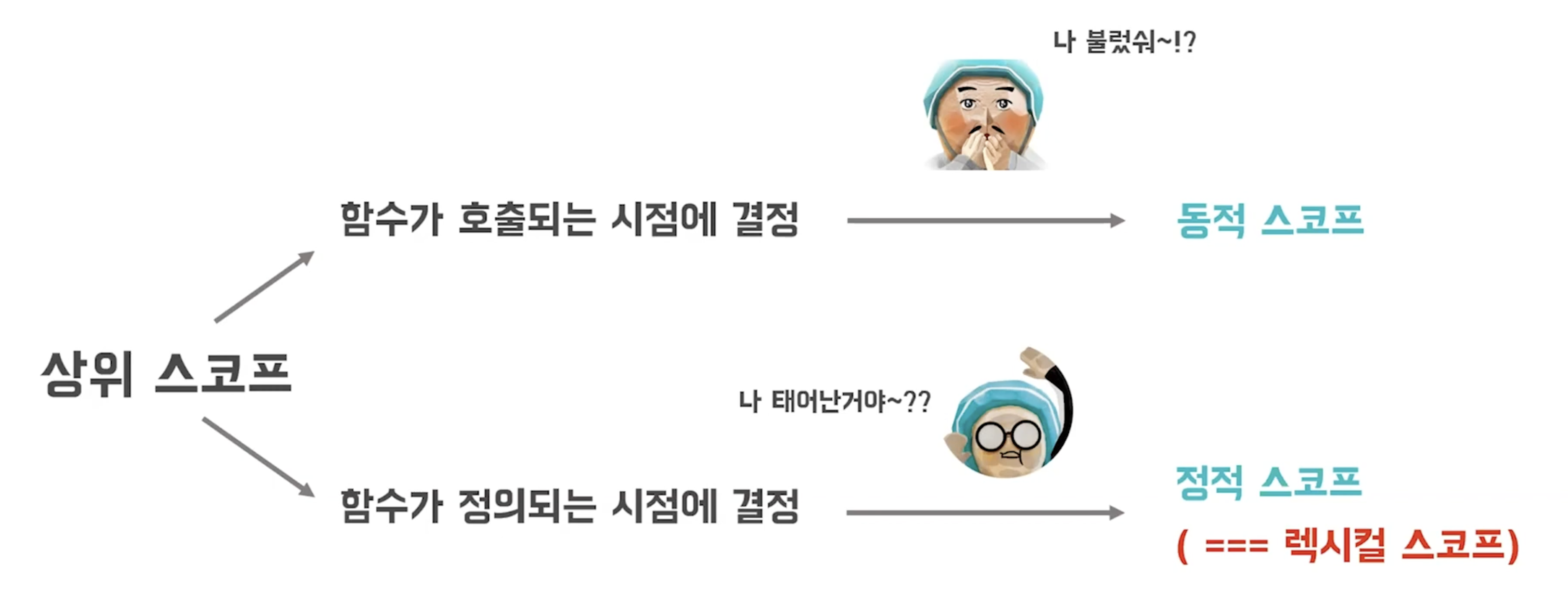 본인이 선언한 위치에 따라 다른 코드에서 자신이 참조될 수 있을지 없을지 결정하는 범위