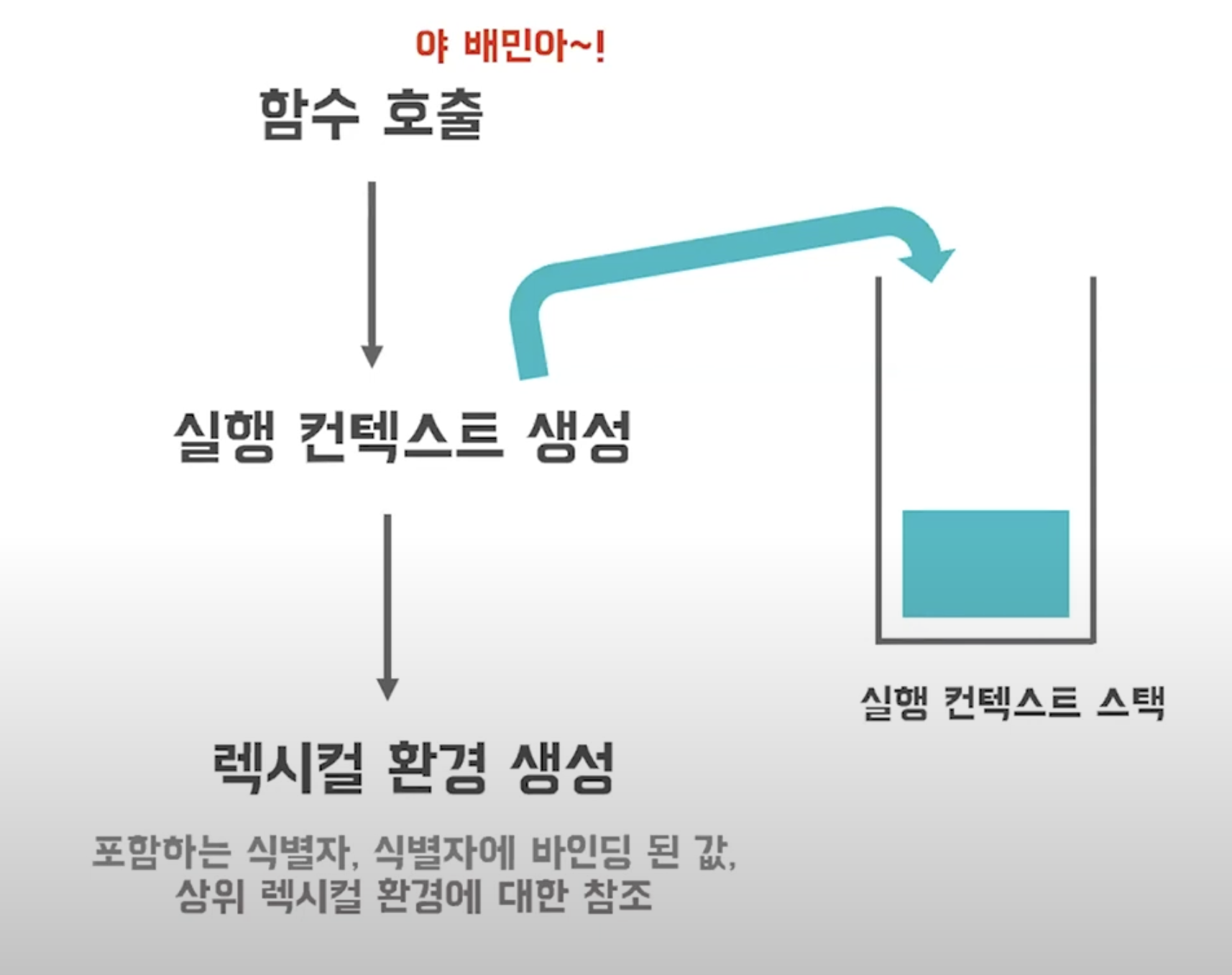 실행 컨텍스트에서 생성하면서 실행 컨텍스트 스택을 쌓음 -> 렉시컬환경 생성 -> 코드 실행이 끝나면 실행 컨텍스트 스택에서 POP됨