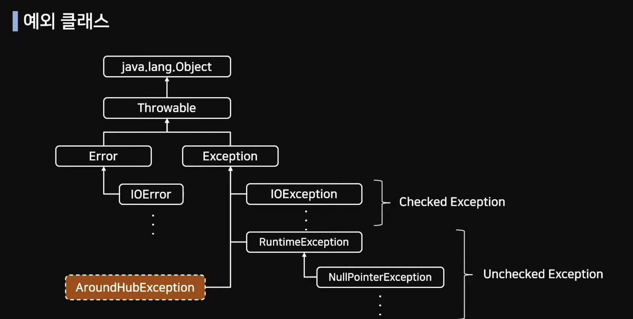 가동 중 발생, 예상치못한 로직의 에러 발생 등 컴파일 때 체크할 수 없는 예외 - Unchecked Exception