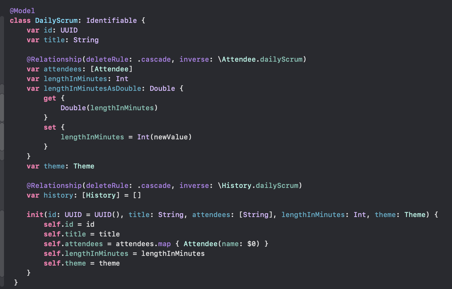 여기서 질문1, Scrumdinger 앱에서 DailyScrum 모델에는 왜 Attribute 를 붙이지 않고 사용한거지??