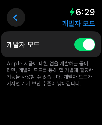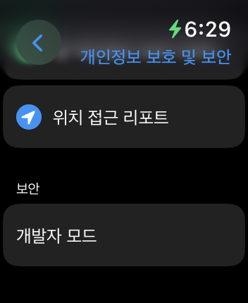 애플워치에서 설정 > 개인정보 보호 및 보안 > 개발자 모드