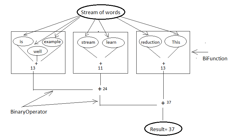 // Find the number of characters in a string. List<String> words = Arrays .asList("This is stream reduction example learn well".split(" ")); int result = words.stream().map(String::length).reduce(0, Integer::sum); Optional<Integer> opt = words.stream().map(String::length).reduce(Integer::sum); result = words.stream().reduce(0, (i, str) -> i + str.length(), Integer::sum); public static void reduceThreeArgs(List<String> words) { int result = words.stream().reduce(0, (p, str) -> { System.out.println("BiFunc: " + p + " " + str); return p + str.length(); }, (i, j) -> { System.out.println("BiOpr: " + i + " " + j); return i + j; }); } output: BiFunc: 0 This BiFunc: 4 is BiFunc: 6 stream BiFunc: 12 reduction BiFunc: 21 example BiFunc: 28 learn BiFunc: 33 well