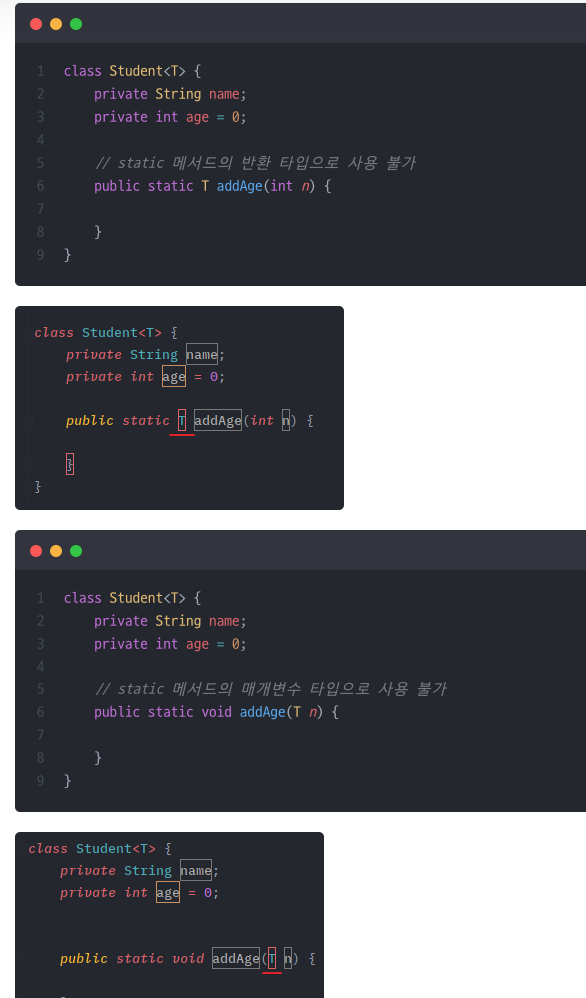 https://inpa.tistory.com/entry/JAVA-%E2%98%95-%EC%A0%9C%EB%84%A4%EB%A6%ADGenerics-%EA%B0%9C%EB%85%90-%EB%AC%B8%EB%B2%95-%EC%A0%95%EB%B3%B5%ED%95%98%EA%B8%B0 ☕ 자바 제네릭(Generics) 개념 & 문법 정복하기 제네릭 (Generics) 이란 자바에서 제네릭(Generics)은 클래스 내부에서 사용할 데이터 타입을 외부에서 지정하는 기법을 의미한다. 객체별로 다른 타입의 자료가 저장될 수 있도록 한다. 자바에서 배 inpa.tistory.com 제네릭 : 클래스 내부에서 사용할 데이터타입을 외부에서 지정하는 기법이다. 각 객체별로 다른 타입의 자료가 저장될 수 있도록 해준다. A..
