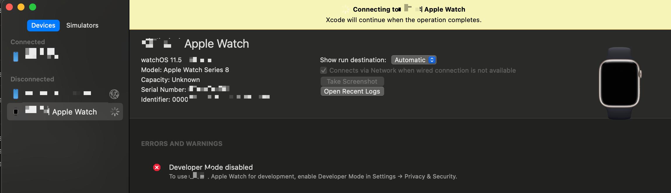 아주 쉬운 수순은 이 방법이라고 하는데, 이 이후에애플워치에서 설정 > 개인정보 보호 및 보안 > 개발자 모드 까지만 설정하면 바로 연결이 된다고 한다. 그 이후에는 XCode 에 이 창을 보며 기다리기만 하면 된다. 이 방법은 모두에게 적용되지 않을 것이다. 아주 쉽게 애플워치에 개발자모드가 뜨는 사람들이 있는가하면, 나처럼 고생하는 사람도 분명 있을 것 같아서 기록해본다. 기존에 이미 아이폰으로 개발자모드를 쓰고 있었다던가 하는 이유인지 아직까지 잘 모르겠다, 아무튼!!! 내 방법이 백퍼 맞는 방법이 아니니까,혹시 돌고돌고돌고 돌다가 이 글을 보고 계신 분이라면 내 방법으로 개발자모드 뜨는게 꼭 되시길 바라면서!!! 일단 애플 디벨로퍼 프로그램 없으신분..?애플 디벨로퍼 프로그램부터..